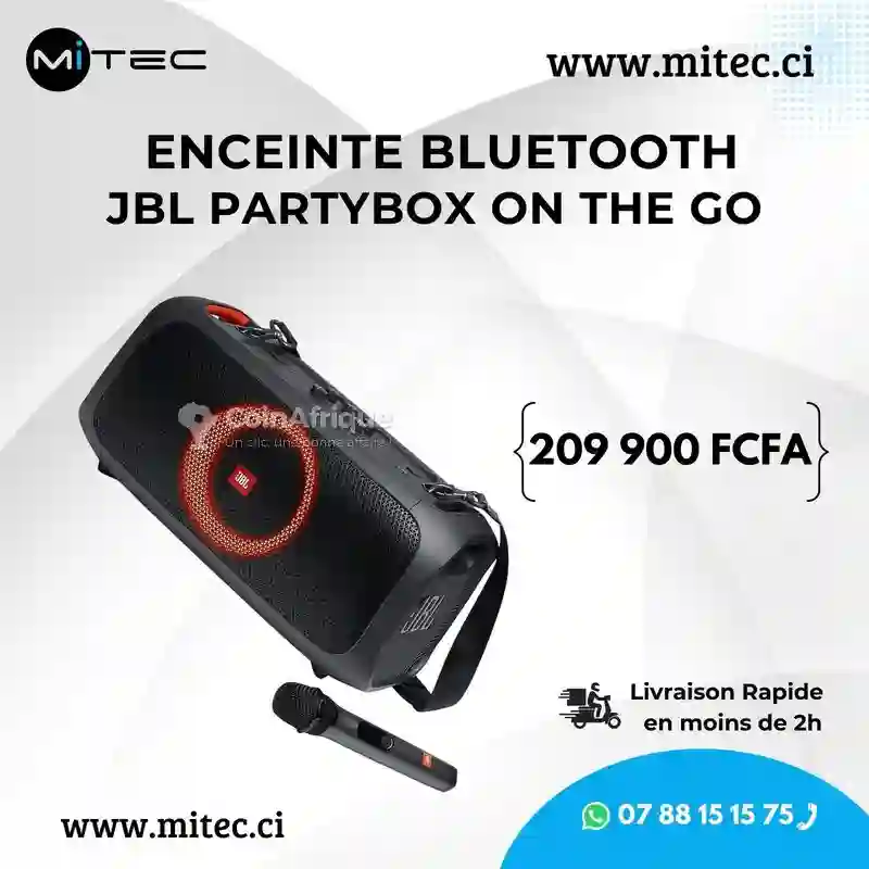 Enceinte Bluetooth JBL PartyBox On-The-Go Neuf En Promo à Mitec ci Livraison Rapide avec Reçu et Garantie. Caractéristiques : Présentation La JBL PartyBox On-The-Go est une enceinte Bluetooth portable polyvalente conçue pour animer tous les moments festifs, que ce soit à la maison, en extérieur, lors de barbecues, pique-niques ou soirées entre amis. Avec un son puissant, une batterie longue durée, des effets lumineux dynamiques et une connexion sans fil intuitive, elle transforme facilement n’importe quel espace en piste de fête ou zone de musique immersive. ???? Caractéristiques principales ???? Audio & performance ▪️Son JBL puissant et clai